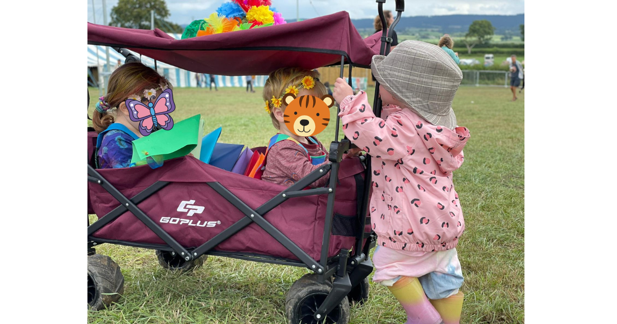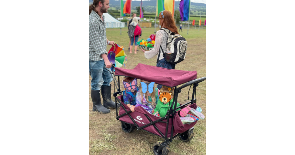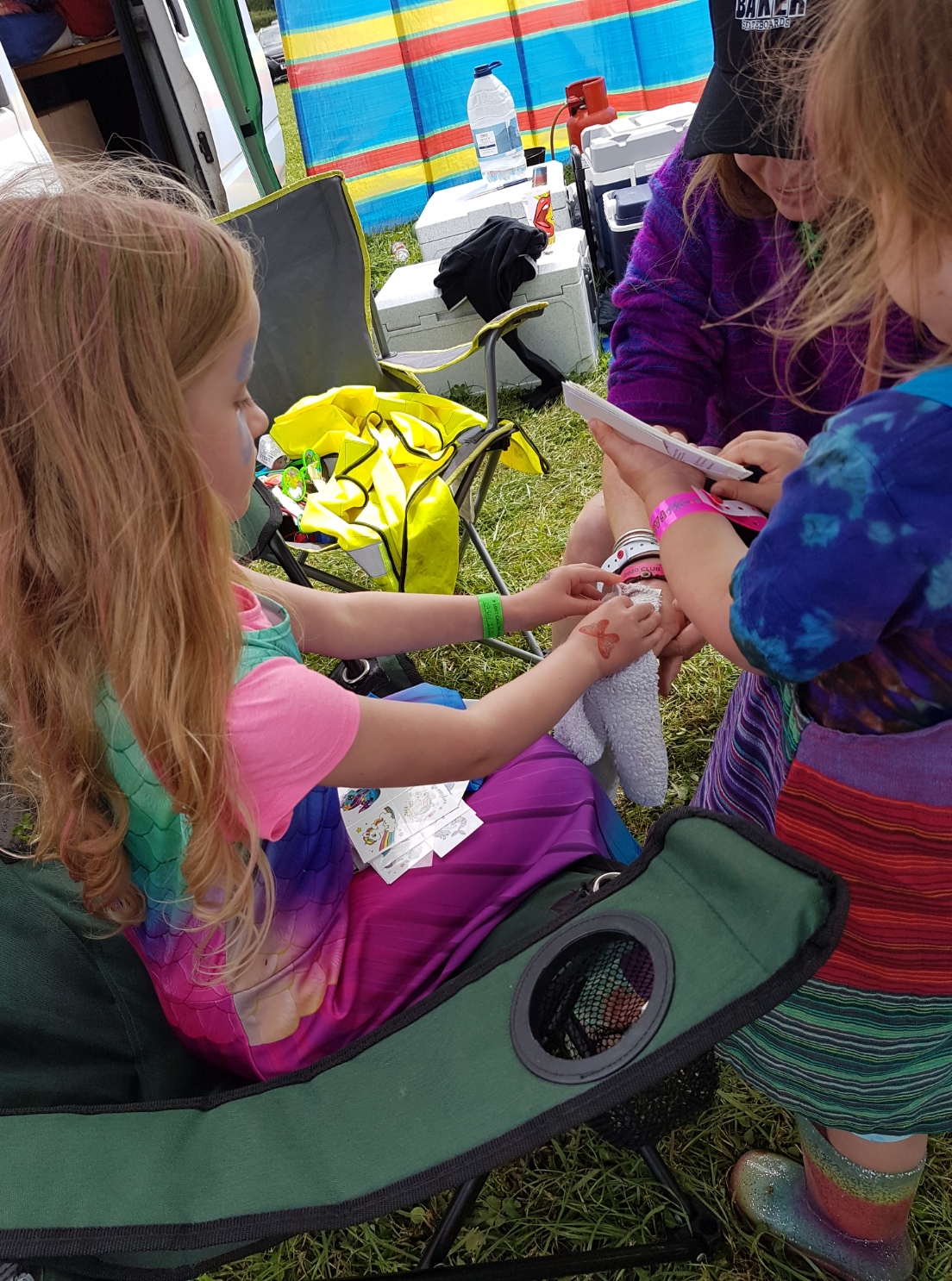 Eventually, of course, the storm abated, the festival opened, we donned our tie-dye and had a pretty good first day. The second night brought tranquil weather, we all slept well (I had B in with me and G turned the ‘fun-zone’ into a single bed for himself) and the next day (Saturday) was great. Our friends got over the tummy bug and won best group in the hat competition, the kids enjoyed a mini rave in the kids’ tent, we donned glitter, temporary tattoos, hair chalk and face paint and joined others dressed in a multitude of festival gear from patchwork to tie-dye, butterfly wings and even a tribe of bees… With nary a hotpant in sight, I did not feel even the slightest bit self-conscious in my wellies, harem pants and ancient crochet top with a rainbow painted on my face. We managed to pull all three kids along in the festival trolley. B got in a decent nap in the tent. We even got a “parenting goals” compliment from a bright-eyed young couple who clearly had no idea what they were looking at.