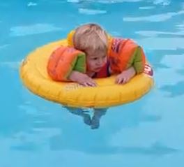 Five minutes later I had B balanced torso-down on my arm, feet duly kicking as his little hands and arms paddled steadily. You could have knocked me down with a feather.