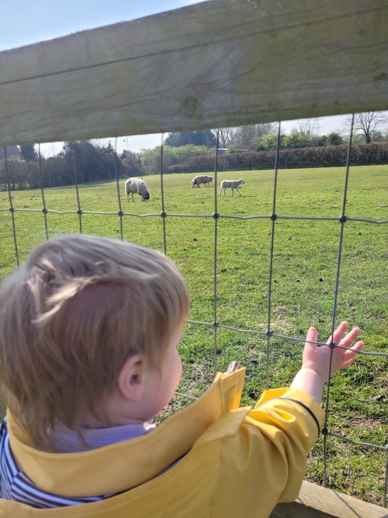 The sun has finally shown its face and in the spirit of Leaving The House, I decided this week that it was high time I took the small one out to try another New Thing. Preferably one which included the purchasing of milk, as we’d just run out. What better destination on a sunny day than a local farm park? It was on our way home from music class, there would be a shop to buy milk (fancy, locally-sourced, farm shop milk to boot) and, best of all, we might get to see some lambs a-frolicking. (OK, me. I might get to see some lambs. B really couldn’t give a shit about baby farm animals if there are tractors and inflatables to mount.)