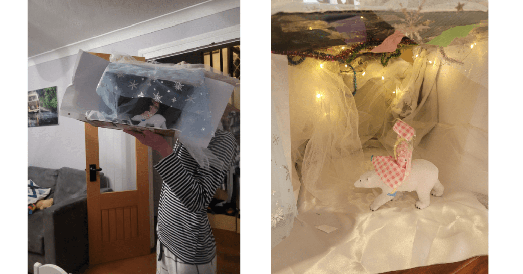 Last year for World Book Day, L (then year 6) decided to make a book in a box, or diorama if you will. She chose the scene in The Golden Compass/ Northern Lights where Lyra is riding the armoured bear Iorek across the ice with the aurora in the background. I duly sourced a small doll and a suitably sized polar bear from our stashes of toys and gave her some tiny fairy lights leftover from one of the aforementioned half-done kits of doom and then something utterly magical happened.